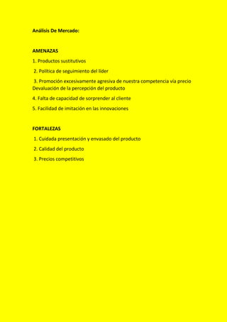 Este documento identifica las amenazas y fortalezas del mercado de una empresa. Las principales amenazas son los productos sustitutivos, las políticas agresivas de la competencia y la facilidad de imitar innovaciones. Las fortalezas clave son la presentación y envasado del producto, su calidad y precios competitivos.