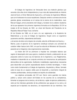 El Colegio de Ingenieros de Venezuela (CIV) tiene una larga historia que se remonta a la época de la independencia. El CIV se estableció oficialmente en 1861 y surgió como un organismo científico dependiente del estado. Actualmente, el CIV promueve el desarrollo de la ingeniería y protege los intereses públicos a través de la participación democrática y el asesoramiento al estado. El CIV también opera tres fundaciones dedicadas a la educación continua, la divulgación científica y tecnológica