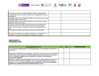 Este documento resume la información recopilada durante la visita 8 de acompañamiento in situ para evaluar 4 indicadores relacionados con los recursos tecnológicos disponibles, la organización, la formación docente y las prácticas pedagógicas implementadas durante el acompañamiento. Se recopilaron datos sobre el número de estudiantes por computador, tipos de conexión a internet, capacidad del aula de informática, uso de las TIC en la planificación docente y estrategias observadas en los maestros durante el acompañamiento. El maestro