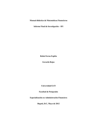 Este documento presenta un manual didáctico sobre matemáticas financieras. Explica conceptos clave como valor del dinero en el tiempo, interés, tasas de interés, interés simple e interés compuesto. También describe indicadores financieros como VPN, CAUE, TIR y métodos de amortización. El objetivo es explicar estos temas de forma sencilla para facilitar su comprensión. Incluye ejemplos y modelos prácticos en Excel.