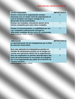 El documento analiza las fortalezas, debilidades, oportunidades y amenazas (DAFO) de una organización. Entre las fortalezas se encuentran las capacitaciones internas que permiten el crecimiento profesional de los trabajadores y el reconocimiento de los cumpleaños. Las principales debilidades son la falta de comunicación sobre el personal nuevo y rotaciones, y el seguimiento inadecuado a los empleados nuevos. Dentro de las oportunidades se destaca el reconocimiento de la compañía por su presencia multinacional, mientras que las amen