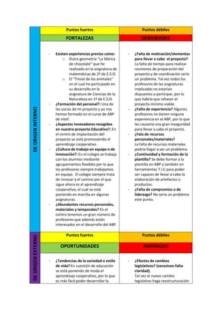El documento analiza los puntos fuertes y débiles, oportunidades y amenazas de un proyecto educativo basado en el aprendizaje por proyectos. Entre los puntos fuertes se encuentran la experiencia previa del centro en proyectos similares y la formación recibida en aprendizaje por proyectos. Las oportunidades incluyen las tendencias educativas actuales y el apoyo de instituciones. Entre las debilidades y amenazas se mencionan la falta de tiempo, recursos y continuidad en la formación del profes