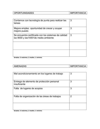 Este documento presenta un análisis DAFO de una organización. Identifica sus principales fortalezas como su liderazgo en derechos humanos, capacitación al personal y programas de salud. Sus debilidades incluyen falta de trabajo en equipo, fondos y espacio. Las oportunidades son la tecnología disponible y posibilidades de crecimiento. Las amenazas son malas condiciones de trabajo, equipo de protección insuficiente y falta de organización.