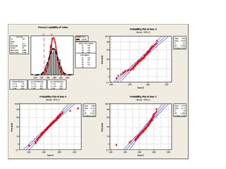 El documento presenta información sobre la medición de la capacidad de procesos. Explica conceptos como los índices Cp, Cpk, Cpm y cómo interpretarlos. También incluye ejemplos y datos sobre el análisis de capacidad de un proceso de fabricación de vidrio y los resultados obtenidos.