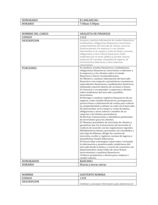 El documento describe los detalles de varios cargos importantes como Director General, Gerente de Recursos Humanos, Analista de Finanzas, Asistente Nomina y Jefe de Cotración. Proporciona información sobre las funciones clave, honorarios y horarios de cada cargo.
