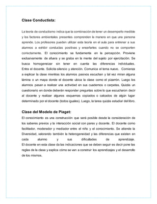 El documento presenta un análisis de diferentes métodos de enseñanza como la clase conductista, el modelo de Piaget, el aprendizaje significativo de Ausubel, el modelo de Vygotsky, la clase humanista y el método ecológico. Resume cada método describiendo sus características principales como el uso de estímulos y refuerzos en la clase conductista, la consideración de los saberes previos del estudiante en el modelo de Piaget, y la importancia de los ambientes y la investigación naturalista en el método ecológico
