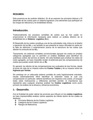 Este documento presenta los principios básicos del desarrollo de los costos en un sistema logístico. Explica las categorías de costos logísticos como los operacionales y de transporte. También cubre los rangos de relevancia de los costos y la importancia de analizar la rentabilidad directa de los clientes y productos para evaluar la eficacia de un sistema logístico.