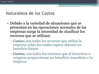 El documento de Lionel E. Pineda L. abarca un análisis detallado de costos, incluyendo su naturaleza, clasificación, y relación con el punto de equilibrio operativo. Se destacan distintas metodologías como el costeo directo y absorbente, así como el estado de fabricación para determinar el costo de producción. Además, se presentan datos prácticos y ejemplos para ilustrar la aplicación de estos conceptos en situaciones empresariales.