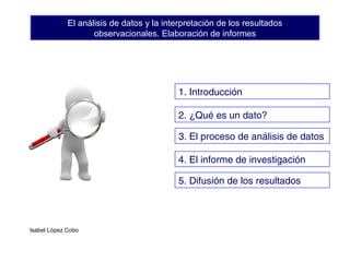 El documento aborda el análisis de datos y la interpretación de resultados en investigaciones, destacando la importancia de la recolección, sistematización y presentación de datos. Se detalla el proceso de análisis cualitativo, que incluye fases como la recogida, reducción y codificación de datos, así como la elaboración de informes de investigación. El informe debe incorporar una estructura que contenga introducción, fundamentación teórica, metodología y conclusiones para asegurar la validez del estudio.