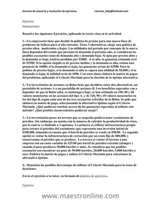 Este documento ofrece servicios de asesoría y resolución de ejercicios en ciencias. Proporciona información de contacto a través de correo electrónico y sitio web para cotizaciones. Además, incluye ejemplos de ejercicios resueltos aplicando diferentes métodos de toma de decisiones como árboles de decisión, matrices de pagos y cadenas de Markov.