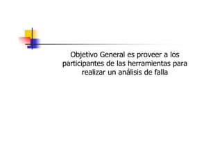 El documento presenta un análisis sobre análisis de fallas. Explica que el objetivo general es proveer herramientas para realizar un análisis de falla. Define falla y analiza conceptos como mecanismo de falla, sucesos condicionadores y activadores de fallas. También describe el proceso de análisis de falla y diferentes métodos estadísticos para analizar fallas como diagrama de Pareto, tasa de falla y análisis de criticidad.