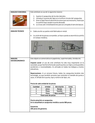 Este documento analiza un sacapuntas metálico compuesto por tres piezas: una base metálica, una cuchilla y un tornillo ajustador. Describe la forma y dimensiones de cada pieza, así como su función de sacarle punta a los lápices de manera segura. Además, explica que estos objetos se venden comúnmente en papelerías y tiendas, y que su uso ha sido importante en la sociedad para facilitar el afilado de lápices. Por último, resume brevemente la historia de los sacapuntas, desde su invención
