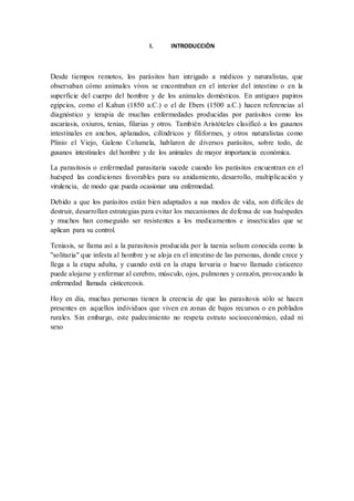Este documento presenta los resultados de un análisis de parásitos realizado por estudiantes de microbiología. Observan muestras de protozoos, céstodos y nematodos usando un microscopio, incluyendo una fasciola hepática, proglótidos de céstodos y una tenia saginata. Concluyen que la higiene es importante para prevenir enfermedades parasitarias transmitidas por alimentos o vectores, y que el estudio ayuda a entender cómo los parásitos se adhieren e infectan a los huéspedes.