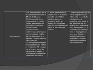 El documento discute el modelo de educación flexible, el cual se está implementando en todo el mundo debido a su accesibilidad para estudiantes e instituciones. La incorporación de las TIC al sistema educativo ha abierto nuevas posibilidades de formación al avanzar hacia este modelo flexible. Cada vez es más necesario el conocimiento y uso de las TIC para todos los involucrados en el sistema educativo, ya que son indispensables para adquirir y transmitir conocimientos.