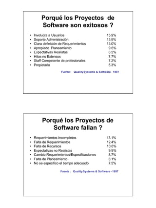 El documento analiza los requerimientos para proyectos de software. Explica que más del 30% de los proyectos de software son cancelados y más del 70% fallan en entregar las características esperadas. Además, un proyecto promedio excede el presupuesto en un 189% y los plazos en un 222%. Luego, identifica factores clave para el éxito como involucrar usuarios, definir claramente los requerimientos y tener expectativas realistas. Finalmente, enfatiza la importancia de una buena administración de requerimientos para