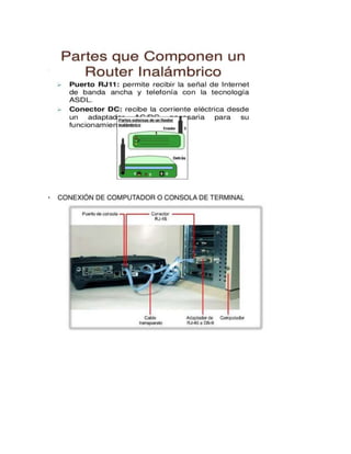 Este documento analiza un router inalámbrico D-Link DSL-2740B. Explica qué es un router, sus partes internas y funciones principales como dirigir paquetes de datos a través de redes. Describe el proceso de arranque de un router y su historia, desde los primeros dispositivos con funciones similares hasta modelos más recientes con mejoras como mayor velocidad y capacidad wifi.