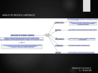 Este documento analiza los riesgos laborales en el Instituto Universitario Politécnico. Ronald P. Altuvé G., con C.I. 16.656.394, realiza un análisis de los posibles riesgos a los que se enfrentan los trabajadores y propone medidas para prevenir accidentes y proteger la salud de los empleados.