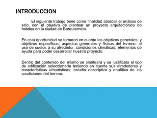 El documento presenta un análisis de sitio para un proyecto arquitectónico de hoteles en Barquisimeto, Venezuela, considerando objetivos generales y específicos relacionados con el entorno, el uso de suelos y las condiciones climáticas. La investigación incluye un estudio del terreno, su infraestructura de servicios, y se concluye que un hotel urbano es la edificación más adecuada para la zona dada su cercanía a comercios y áreas de negocio. Se destaca que, a pesar del clima cálido y la vegetación escasa, el proyecto busca mejorar la perspectiva visual y turística del área.