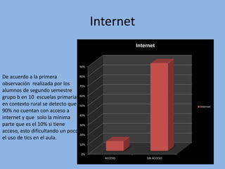 El documento resume los hallazgos de una observación de 10 escuelas primarias rurales en cuanto al uso de la tecnología. Se encontró que el 90% no tiene acceso a Internet, solo el 30% tiene una sala de medios y el 70% no tiene un profesor de computación. La mayoría de equipos tecnológicos son obsoletos y hay poca inversión en su mantenimiento. El software más usado es Office debido a la falta de Internet. La mayoría de profesores usan sus propias laptops para trabajar.