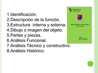 El documento presenta un análisis de un teclado como objeto tecnológico. Incluye la identificación del teclado, la descripción de su función como entrada de datos a un ordenador, el análisis de su estructura interna y externa, las partes que lo componen, y análisis funcional, técnico, constructivo e histórico. El documento provee una descripción detallada del teclado para comprender su diseño, funcionamiento y origen.