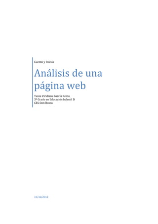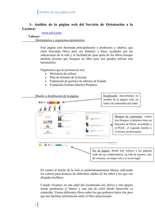 Este documento analiza dos páginas web relacionadas con la literatura infantil y juvenil. En la primera parte, se analiza la página web del Servicio de Orientación a la Lectura (SOL-E), destacando que está destinada a profesores, adultos y jóvenes en búsqueda de libros. Se valora positivamente su diseño y estructuración intuitiva, aunque se señala que la sección de familias y profesionales es poco visual. En la segunda parte, se analiza la página web de la editorial SM, destinada principalmente a