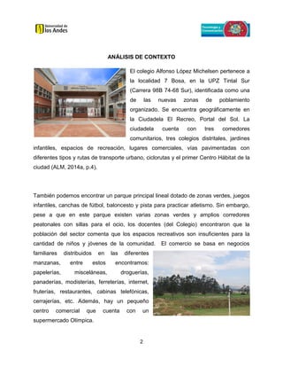 El documento analiza el contexto del colegio Alfonso López Michelsen, ubicado en la localidad 7 de Bosa, Bogotá, resaltando sus características físicas, las necesidades recreativas de la comunidad y la carencia de centros de salud cercanos. Se detalla la estructura educativa del colegio, que fomenta una educación integral centrada en la comunicación, el arte y la expresión, y se discuten las encuestas realizadas a estudiantes y padres que revelan aspectos sobre su dinámica familiar y cultural. Además, se abordan los recursos disponibles en la institución y se sugiere mejorar la relación entre las asignaturas de comunicación y tecnología para fortalecer el proceso educativo.