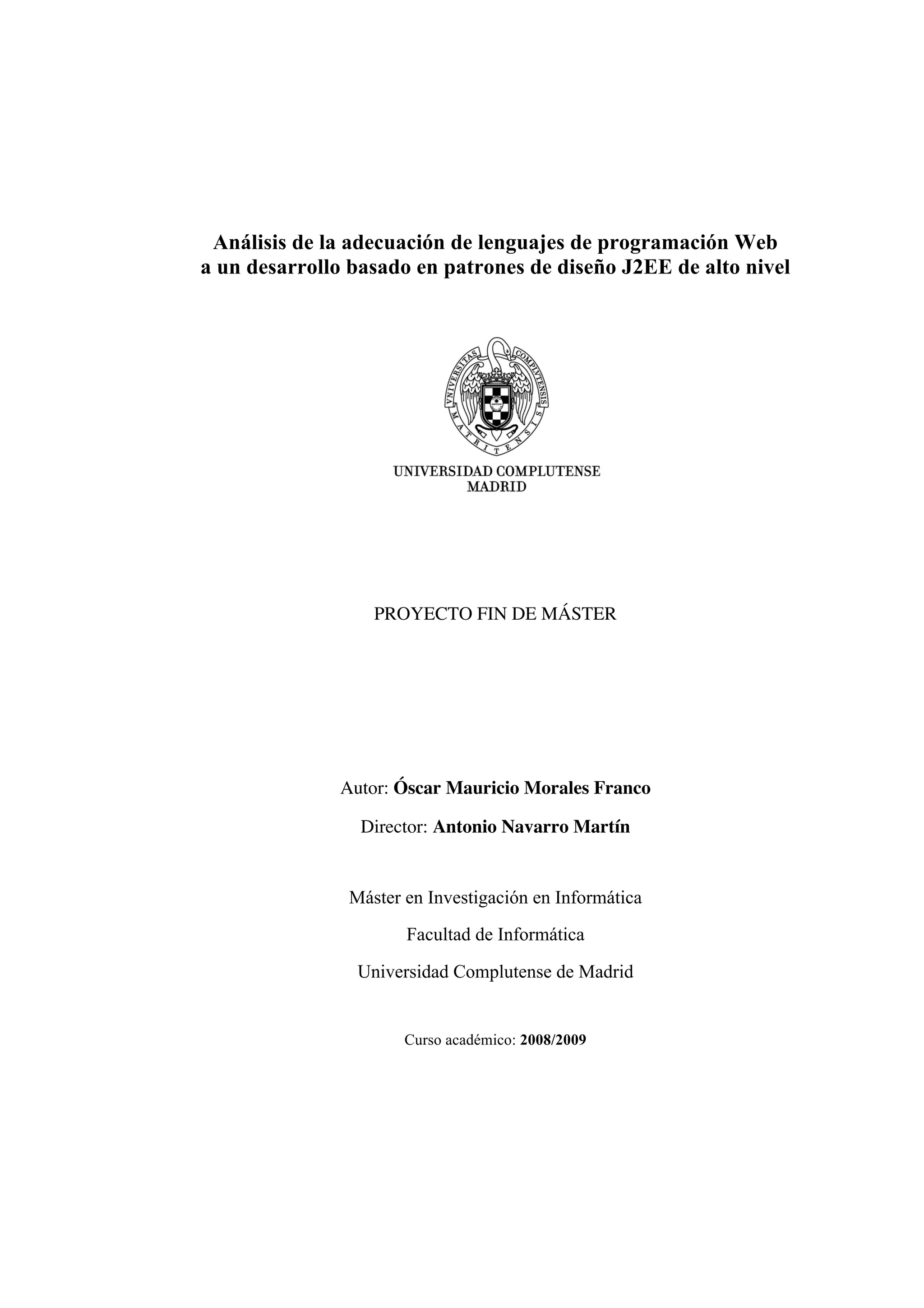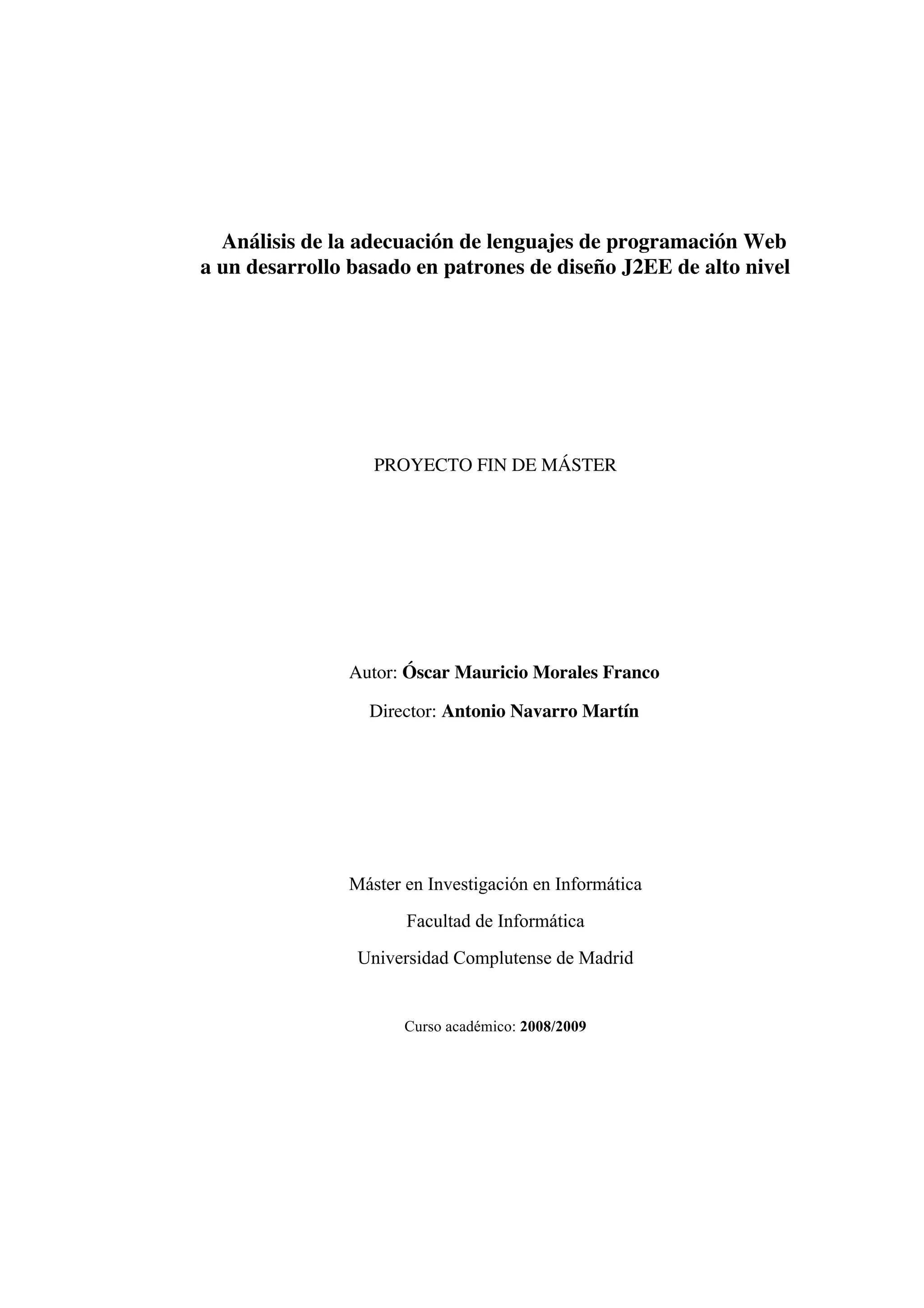 Este documento analiza la adecuación de diferentes lenguajes de programación web como PHP, ASP.NET y J2EE para el desarrollo de aplicaciones basadas en patrones de diseño J2EE de alto nivel. Describe los patrones de diseño J2EE analizados y las tecnologías consideradas. Realiza un mapeo entre las ontologías de patrones de diferentes fuentes y analiza los patrones requeridos para aplicaciones con persistencia, concurrencia y mensajería.