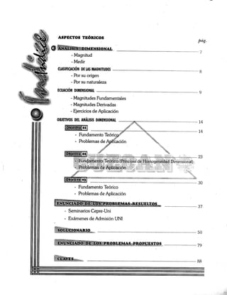 Este documento trata sobre el análisis dimensional en física. Explica conceptos como magnitudes fundamentales, derivadas y ecuaciones dimensionales. Luego presenta ejemplos de cálculo de ecuaciones dimensionales para magnitudes como velocidad, aceleración, fuerza y trabajo mecánico. Finalmente, muestra cómo expresar magnitudes derivadas en función de las fundamentales usando el análisis dimensional.