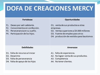 El documento presenta los análisis DOFA de varias empresas y fabricantes colombianos. Resume sus fortalezas como el esfuerzo, dedicación y búsqueda de oportunidades; debilidades como falta de recursos y reconocimiento inicial; y amenazas como no alcanzar metas de ventas o perder clientela.