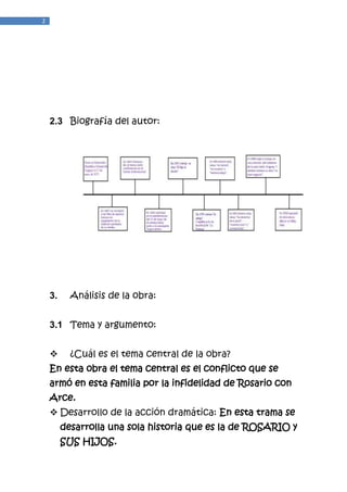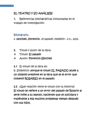 Este documento resume la obra de teatro "El pasado" de Florencio Sánchez. Trata sobre la familia de Rosario y los conflictos que surgen luego de que se revela que ella fue infiel en el pasado, lo que llevó a su esposo al suicidio. El tema central es el perdón y cómo sus hijos reaccionan de manera diferente cuando se enteran de la verdad, especialmente Ernesto quien nunca puede perdonar a su madre. Al final, Rosario logra obtener el perdón de José Antonio y Silvia, pero Ernesto se va del país