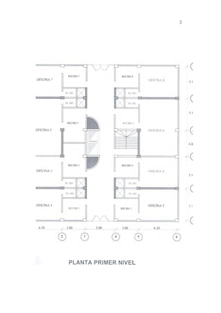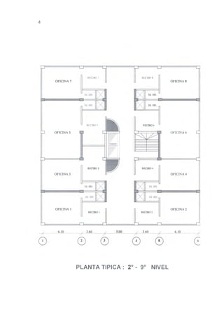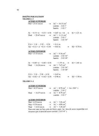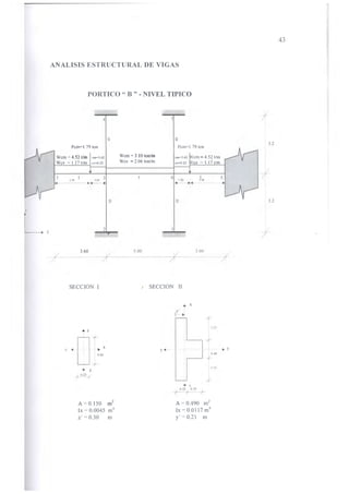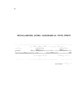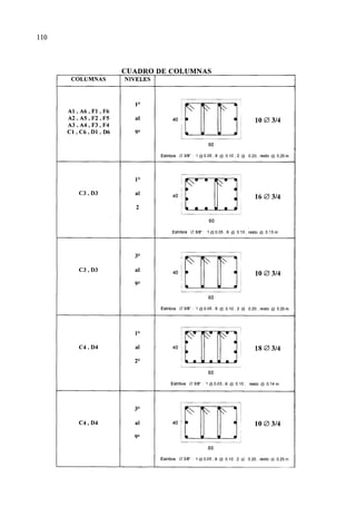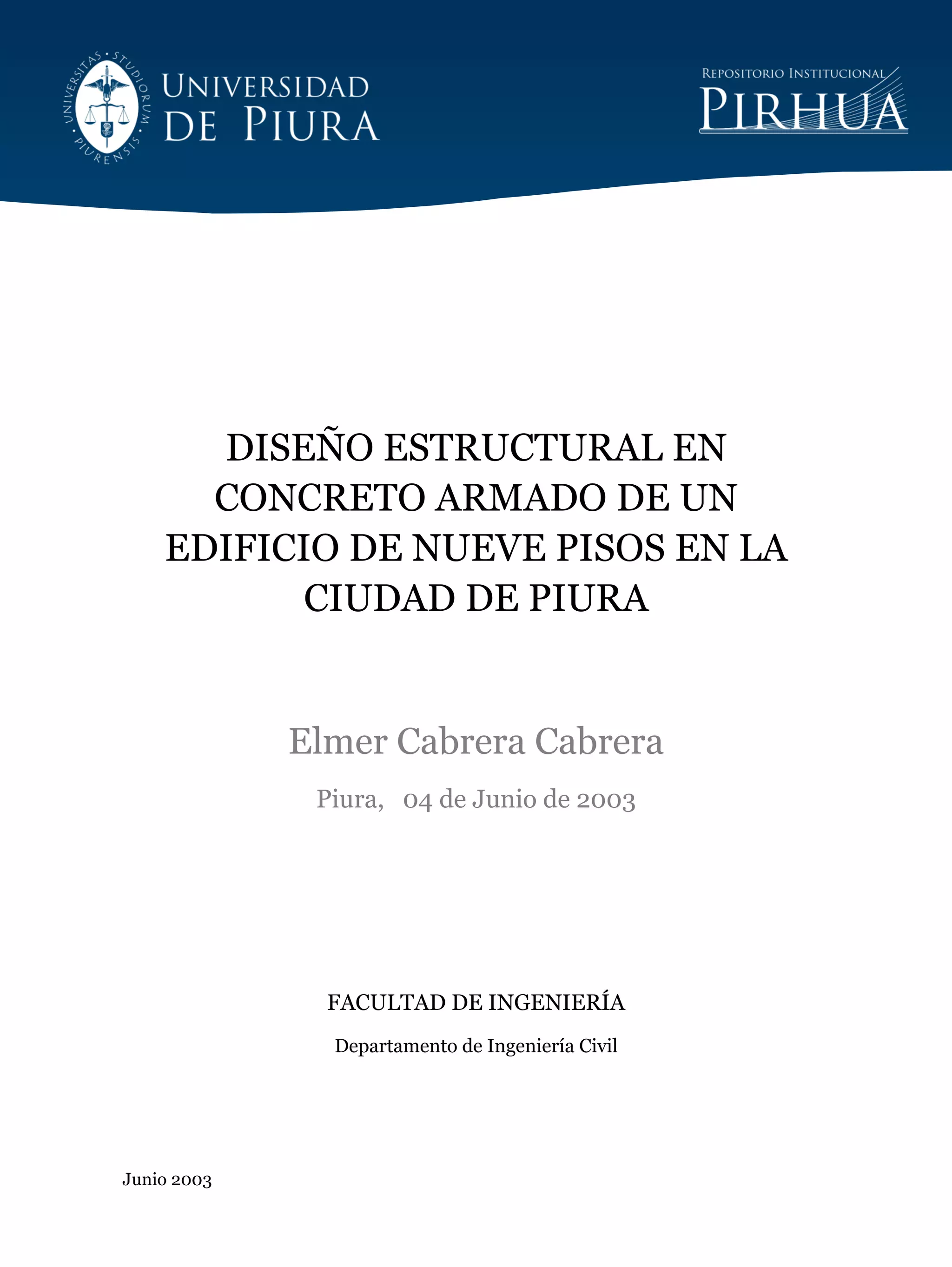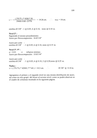 El documento presenta el diseño estructural en concreto armado de un edificio de nueve pisos en la ciudad de Piura. Inicialmente se realiza un estudio del suelo de cimentación para determinar el tipo de cimentación más adecuado, eligiéndose pilotes debido a las características del suelo. Luego se estructura y predimensionan los elementos estructurales principales del edificio. Posteriormente se realiza el análisis estructural bajo cargas sísmicas y gravitatorias para finalmente diseñar en detalle los