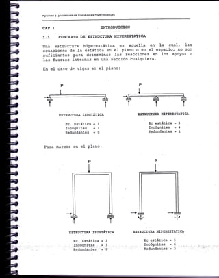Este documento presenta una introducción a las estructuras hiperestáticas. Explica conceptos clave como nudos continuos, grados de libertad, geometría de estructuras, propiedades de los materiales y teorías generales para barras sometidas a fuerzas normales y tangenciales. También incluye tablas con propiedades físicas comunes de materiales de construcción e información sobre unidades de medida.