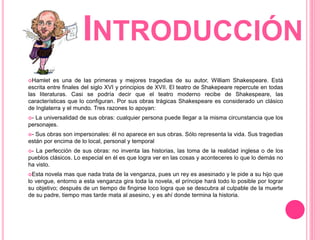 Hamlet es una de las obras más famosas de Shakespeare. Trata sobre el príncipe Hamlet que busca vengar la muerte de su padre, el rey de Dinamarca, a manos de su tío Claudio. Luego de que un espectro le revela la verdad sobre la muerte de su padre, Hamlet finge locura para investigar. Su locura aparente lleva a varias muertes hasta que finalmente Hamlet mata a Claudio y también muere él al enfrentar al hijo de Polonio, Laertes.