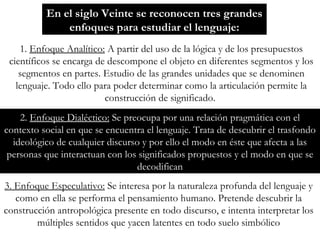 1. El documento discute tres enfoques para estudiar el lenguaje cinematográfico: analítico, dialéctico y especulativo. 2. Señala que el enfoque estructural del cine se ubica en el analítico, el cual estudia las relaciones sintácticas entre elementos para construir significado. 3. Describe los principales elementos del lenguaje cinematográfico como ángulo de cámara, escala de planos, iluminación, y cómo transmiten significados.