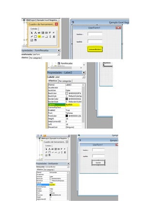 Este documento presenta instrucciones para realizar análisis estadísticos, crear tablas dinámicas e importar datos en Excel, así como para desarrollar un formulario de registro de datos usando Visual Basic. Se explica cómo calcular estadísticas descriptivas, crear gráficos vinculados a tablas dinámicas e importar datos desde archivos de texto, Access y XML. También muestra cómo diseñar un formulario en Visual Basic para registrar nombres y apellidos y guardarlos en una hoja de cálculo usando una macro.