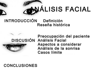 Este documento trata sobre el análisis facial. Brevemente resume la historia del concepto de belleza a través de diferentes épocas, desde los egipcios hasta la actualidad. También analiza aspectos como la simetría, proporciones y ángulos faciales que se consideran atractivos desde un punto de vista estético. Finalmente, discute la importancia de considerar tanto los tejidos blandos como los tejidos duros al realizar un análisis facial completo.