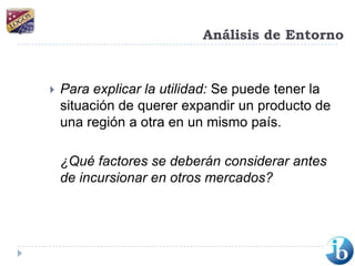 Este documento describe herramientas para analizar el entorno interno y externo de una empresa antes de desarrollar una estrategia, incluyendo el análisis PEST y FODA. El análisis PEST evalúa factores políticos, económicos, sociales y tecnológicos, mientras que el FODA identifica fortalezas, oportunidades, debilidades y amenazas. Estas herramientas son útiles para comprender las condiciones del mercado y la posición competitiva de una empresa.
