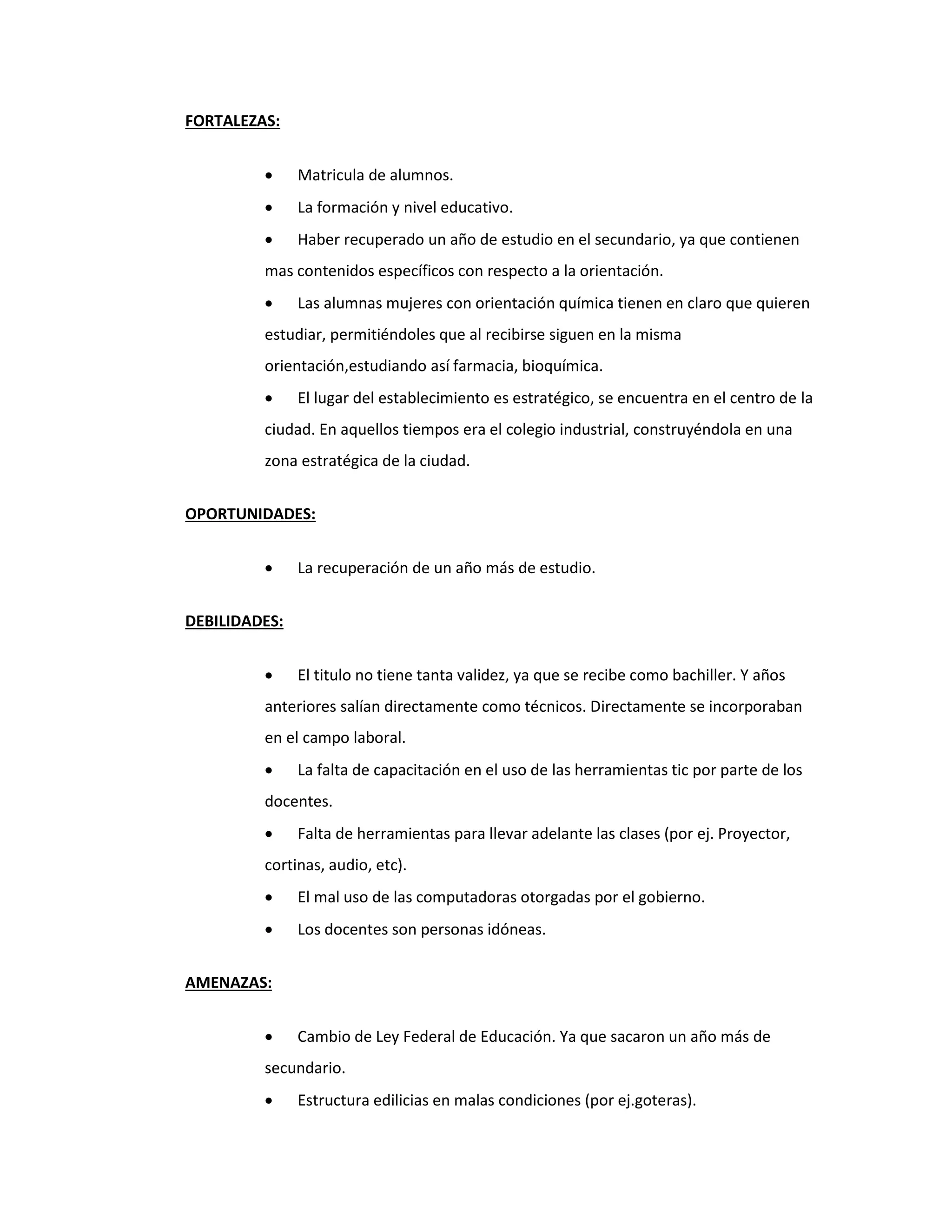 El documento resume las fortalezas, oportunidades, debilidades y amenazas de una escuela secundaria. Las principales fortalezas son su matrícula de alumnos, la formación educativa y el haber recuperado un año de estudio en el secundario. Otras fortalezas incluyen su ubicación estratégica y la orientación de las alumnas mujeres. Las principales debilidades son que el título no tiene tanta validez y la falta de capacitación docente en TIC. Las principales amenazas son un posible cambio en la ley educ
