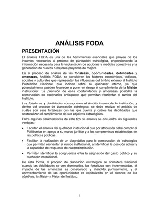 El análisis FODA es fundamental para la planificación estratégica del Instituto Politécnico Nacional, evaluando sus fortalezas, oportunidades, debilidades y amenazas en relación con su entorno económico, político y social. Este análisis permite identificar áreas de mejora y desarrollar estrategias adecuadas para garantizar el cumplimiento de su misión y objetivos. La implementación de acciones correctivas y la adaptación a cambios externos son clave para el éxito institucional.