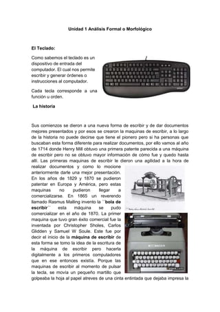 El documento analiza el teclado como un dispositivo esencial de entrada en las computadoras, describiendo su historia desde las primeras máquinas de escribir hasta los teclados modernos. Detalla las diferentes partes del teclado, su ensamblaje, los materiales utilizados en su fabricación y los métodos de conexión a computadoras. Se discute también la importancia del teclado en la escritura, su impacto ambiental y las variaciones en su diseño y funcionalidad.