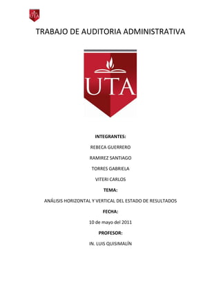 Este documento presenta un resumen del trabajo de auditoría administrativa realizado por un grupo de estudiantes sobre el análisis horizontal y vertical del estado de resultados de una empresa. El resumen incluye la lista de integrantes del grupo, la fecha y el profesor a cargo. Además, contiene un breve análisis del activo de la empresa, señalando las proporciones de cada cuenta y recomendando invertir parte del dinero disponible en el banco para generar mayor rentabilidad.