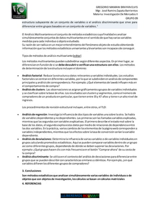 Este documento introduce el análisis multivariado, que involucra el estudio simultáneo de múltiples variables medidas para cada individuo u objeto. Explica que surgen datos multivariados cuando se miden más de una característica por persona y que estos análisis son útiles en investigación de mercados, agricultura y psicología. Luego describe diferentes tipos de métodos multivariados como análisis factorial, de clusters, de regresión, de desviaciones y discriminante, los cuales se usan para descubrir o verificar estructuras subyacentes en