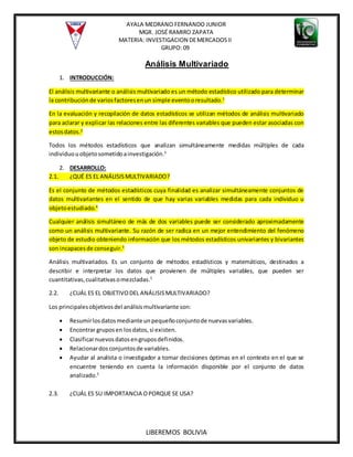 El análisis multivariado es un método estadístico que permite evaluar y clarificar relaciones entre múltiples variables en un conjunto de datos. Su objetivo es resumir datos, encontrar grupos y ayudar en toma de decisiones, destacándose por su capacidad de analizar simultáneamente más de dos variables. Se clasifica en métodos de dependencia e interdependencia, e incluye diversas técnicas como regresión, análisis de cluster y análisis factorial.