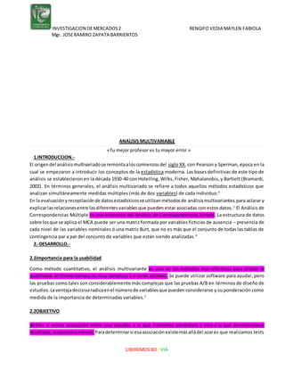 El documento aborda el análisis multivariado, un conjunto de métodos estadísticos que permiten analizar simultáneamente múltiples variables para establecer relaciones entre ellas. Se discuten aspectos como la importancia de la usabilidad, la significación estadística, el tamaño muestral y distintos tipos de técnicas multivariantes como el análisis de regresión y análisis factorial. La conclusión resalta que estos procedimientos son fundamentales para entender la interrelación entre diversas variables en investigaciones de mercado.