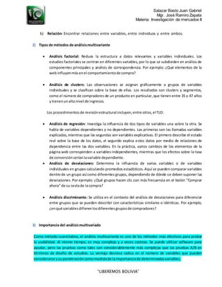 Este documento describe los métodos de análisis multivariado y su importancia para la investigación de mercados. Explica que estos métodos se usan para aclarar las relaciones entre múltiples variables de datos y simplificar grandes conjuntos de datos. Describe varios tipos de métodos como análisis factorial, de clusters, de regresión y discriminante. Finalmente, destaca que el análisis multivariado permite considerar y ponderar más variables que otros métodos, lo que puede ser útil para probar la usabilidad de sitios web y optimizar tasas de conversión