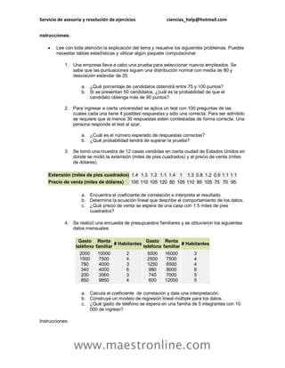 Este documento presenta cuatro ejercicios de análisis multivariante para ser resueltos. El primer ejercicio involucra el cálculo de probabilidades y coeficientes de correlación sobre datos de pruebas de selección y precios de viviendas. El segundo ejercicio pide realizar un análisis factorial sobre datos de encuestas. El tercer ejercicio solicita aplicar análisis discriminante a datos de viajes. El cuarto ejercicio pide investigar técnicas multivariadas como análisis factorial, MANOVA y de conglomerados.