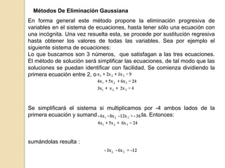 Este documento presenta varios métodos para resolver sistemas de ecuaciones lineales, incluyendo el método de eliminación de Gauss, descomposición LU, factorización de Cholesky, y métodos iterativos como Gauss-Seidel y Jacobi. Explica los pasos matemáticos involucrados en cada método y cuándo cada uno es más adecuado para ciertos tipos de sistemas.