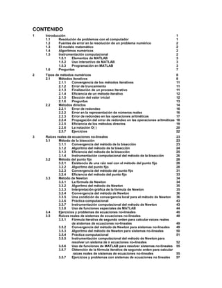 Este documento presenta un resumen de los principales temas de análisis numérico básico, incluyendo métodos numéricos para resolver ecuaciones no lineales, sistemas de ecuaciones lineales y no lineales, interpolación, integración numérica, diferenciación numérica y ecuaciones diferenciales ordinarias y parciales. Explica los conceptos teóricos y desarrolla algoritmos para cada método, con ejemplos resueltos usando MATLAB. El documento busca proveer una introducción al análisis numérico con un