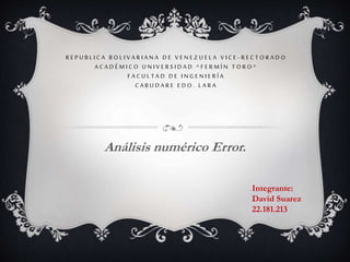 Este documento describe dos tipos de errores en mediciones: el error absoluto, que es la diferencia entre el valor medido y el valor exacto, y el error relativo, que es el cociente entre el error absoluto y el valor exacto. También explica que para reducir el error accidental, una medida debe repetirse tres o cuatro veces y tomarse la media aritmética como el valor real. El error absoluto de cada medida será la diferencia entre esa medida y la media, y el error relativo será el error absoluto dividido por la media.