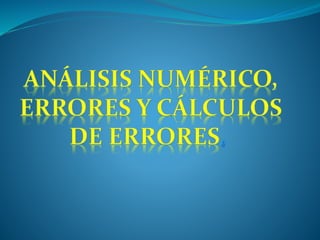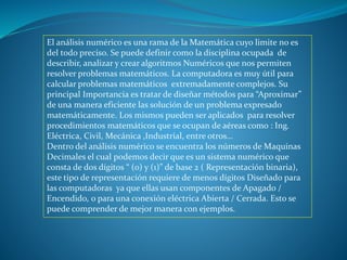 El análisis numérico es la disciplina que estudia algoritmos numéricos para aproximar soluciones a problemas matemáticos. Incluye temas como números de máquina, cálculo de errores, y métodos para resolver ecuaciones. Los errores numéricos surgen de la aproximación requerida para que las computadoras resuelvan problemas y de redondeos en los cálculos. Minimizar los errores es importante para obtener resultados precisos.